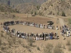 جااء ذلك في وقفة قبلية مسلحة وواسعه لمشائخ ووجهاء وأبناء المديريه حيث القوا العديد من الكلمات والذي تناولت جميعها أهمية التفاعل بجدية ومسئوليه واهتمام لمواجهة تكالب الاعداء وقوی الشر والانحطاط والانحراف