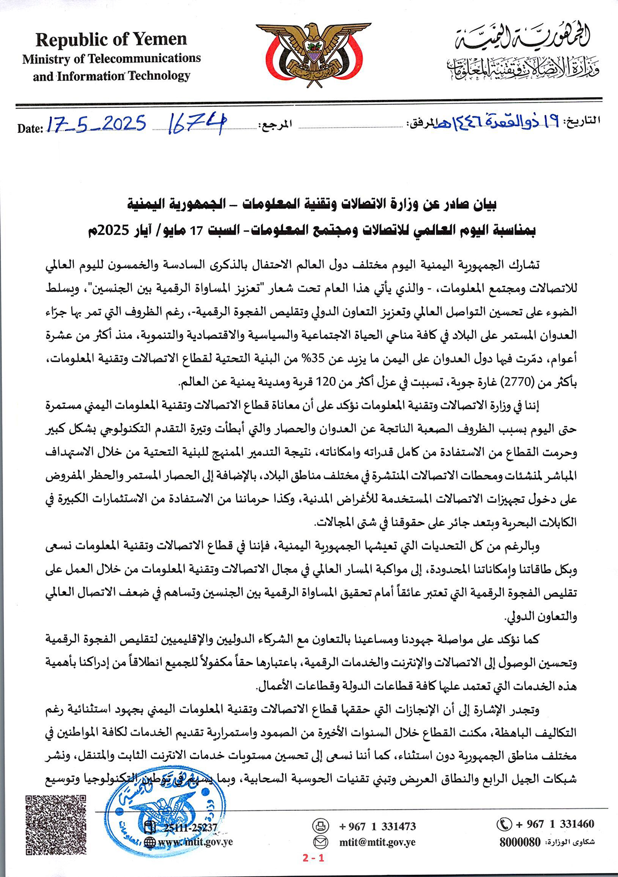 وبهذه المناسبة صدر عن وزارة الاتصالات وتقنية المعلومات في حكومة صنعاء، بيانا، أوضحت فيه أن الحرب العدوانية على اليمن دمّرت ما يزيد عن 35% من البنية التحتية لقطاع الاتصالات وتقنية المعلومات، بأكثر من (2770) غارة جوية، تسببت في عزل أكثر من 120 قرية ومدينة يمنية عن العالم.