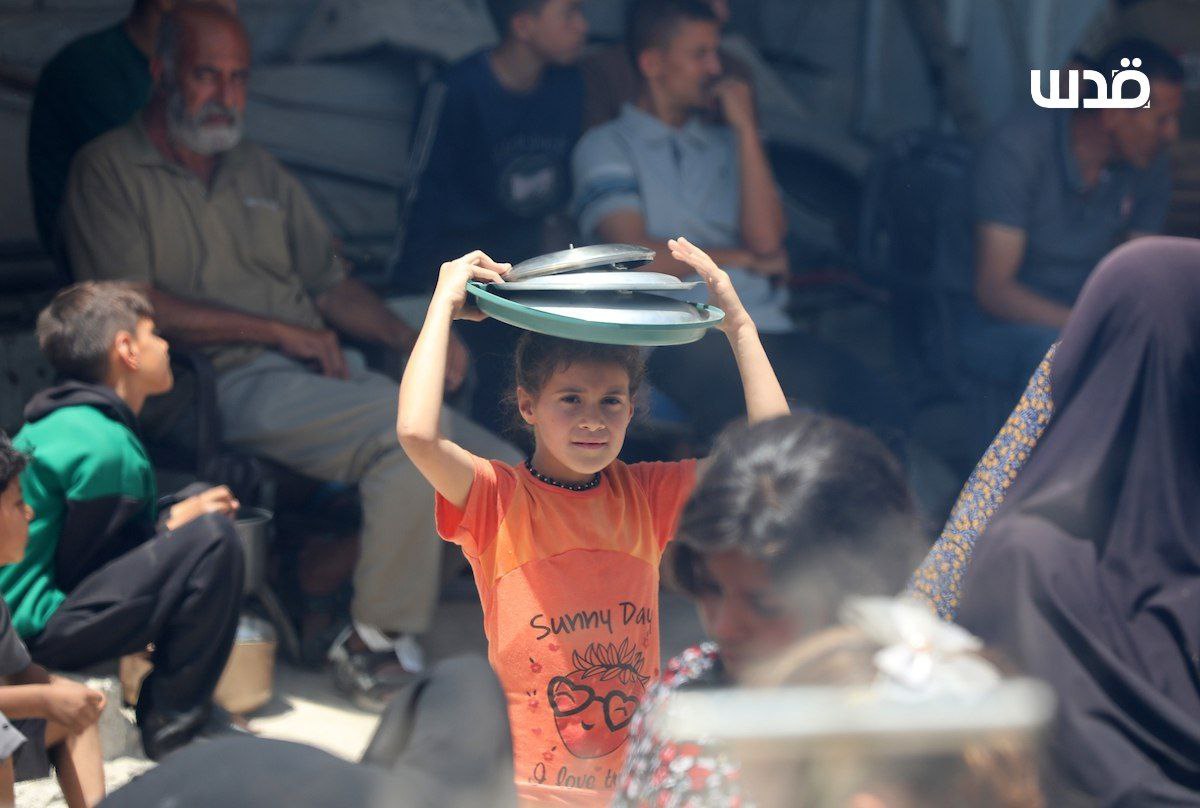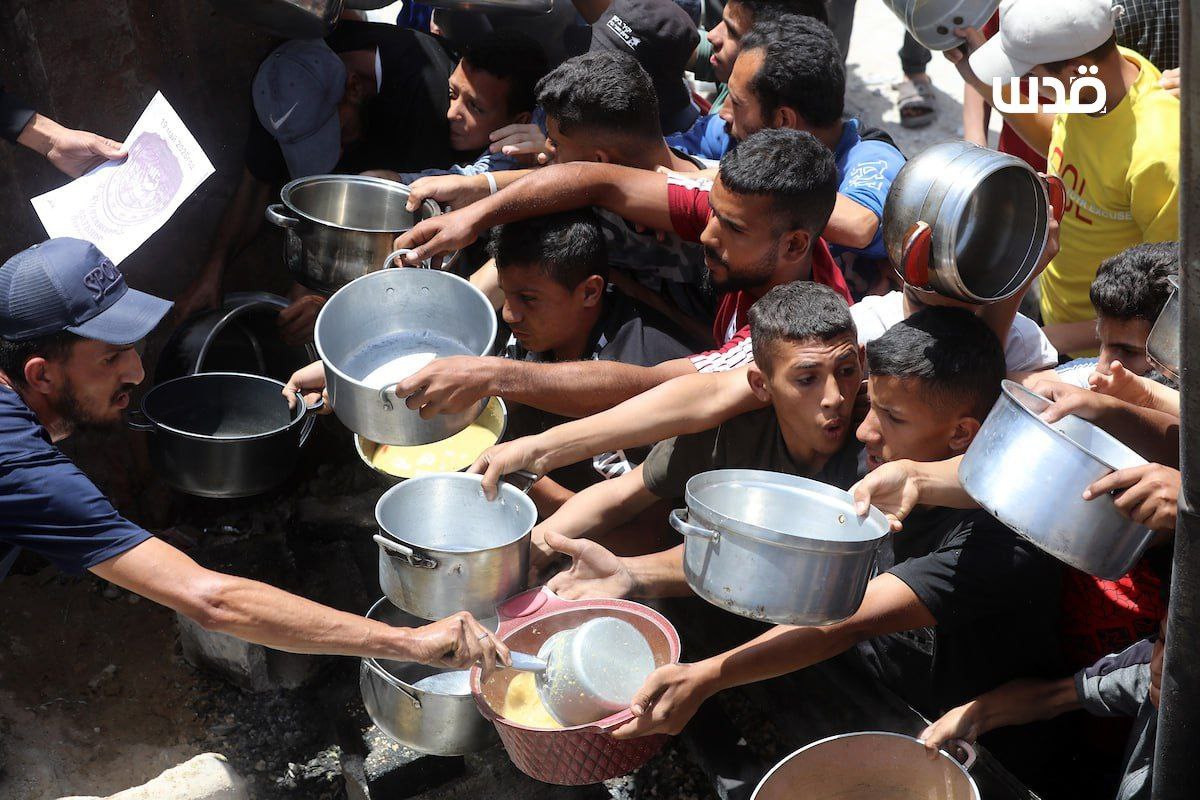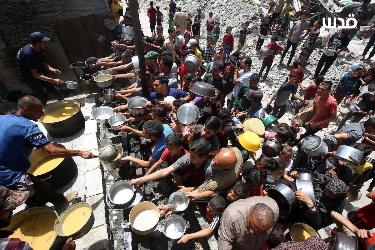 فلسطينيون يتزاحمون على تكية خيرية في جباليا؛ للحصول على القليل من الطعام، مع اشتداد الحصار وعدوان الاحتلال على قطاع غزة.