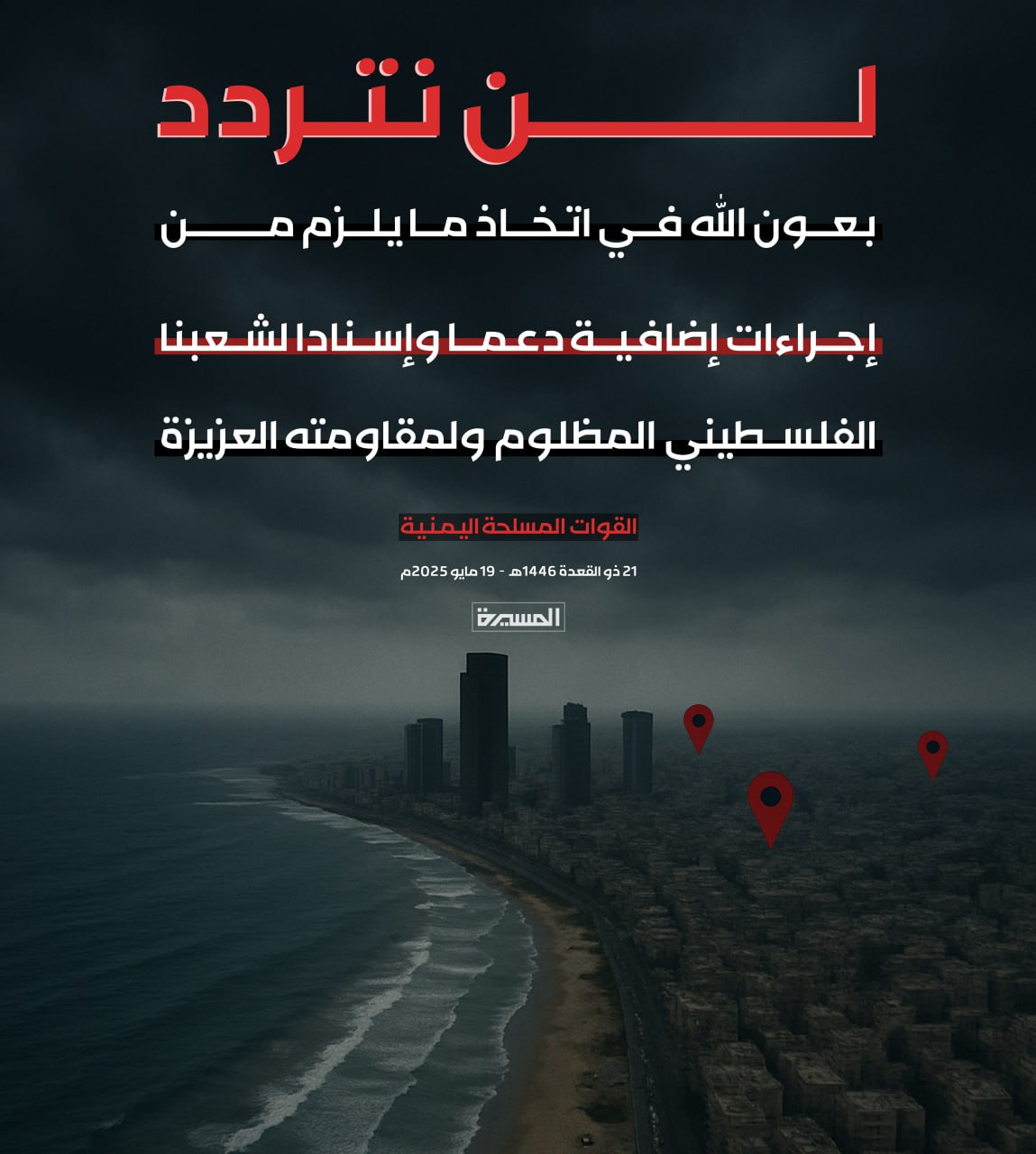القوات المسلحة اليمنية: لن نتردد بعون الله في اتخاذ ما يلزم من إجراءات إضافية دعما وإسنادا لشعبنا الفلسطيني المظلوم ولمقاومته العزيزة.. On مايو 20, 2025