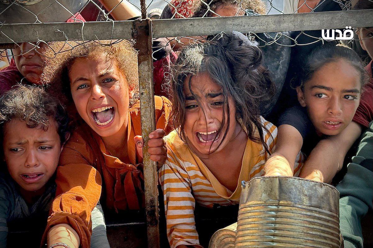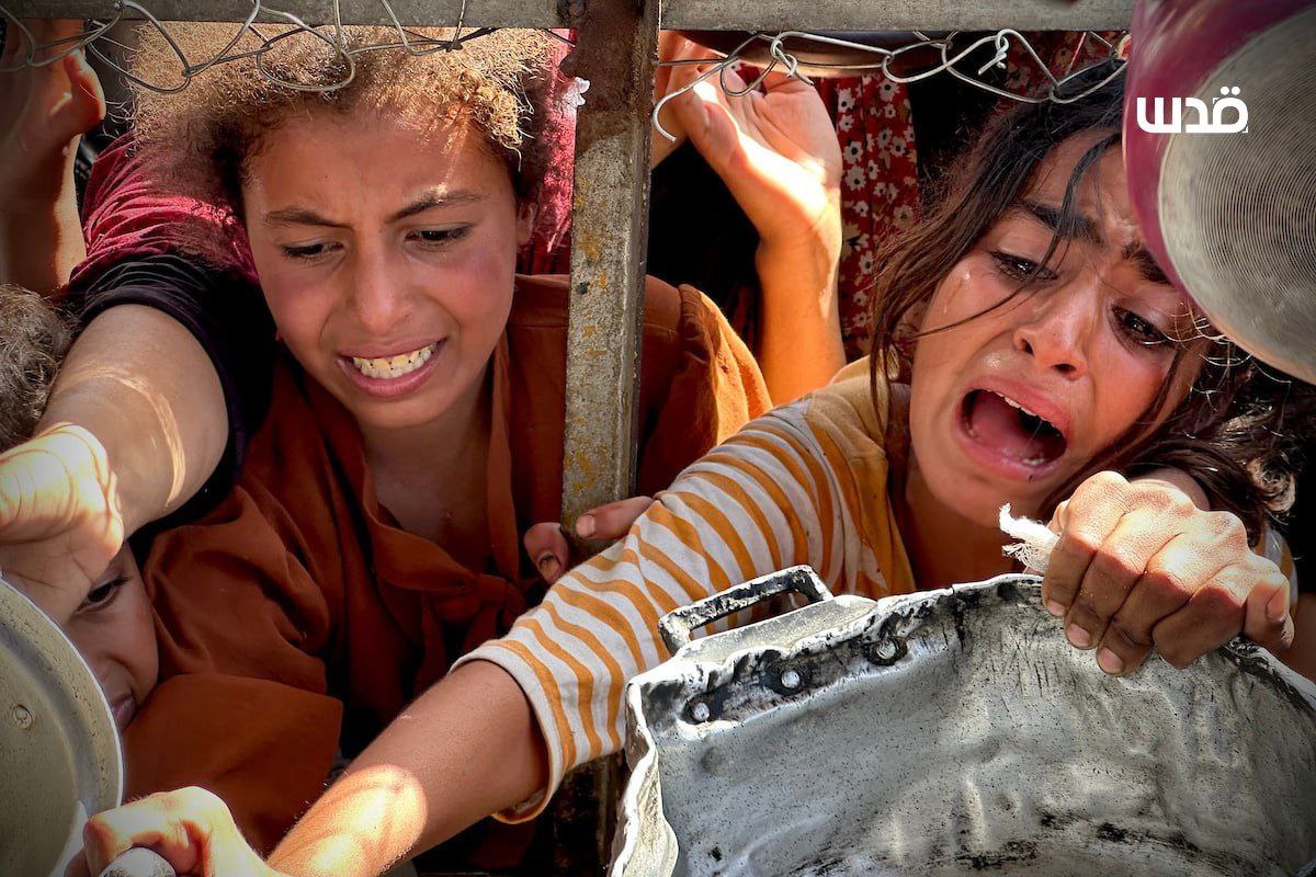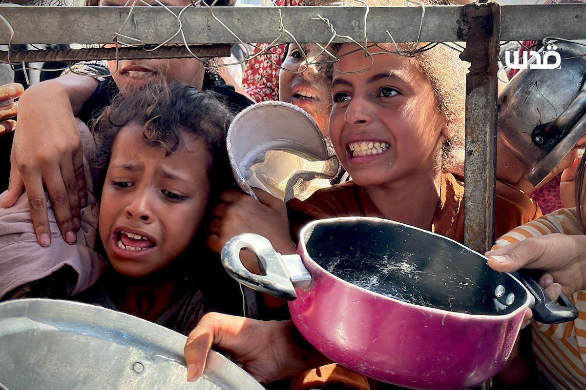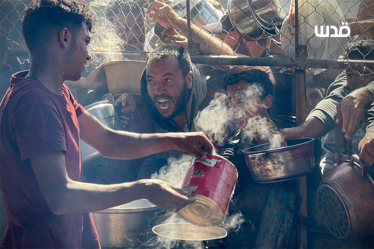 فلسطينيون يتزاحمون على تكية خيرية في خانيونس؛ للحصول على القليل من الطعام، مع اشتداد الحصار وعدوان الاحتلال على قطاع غزة.