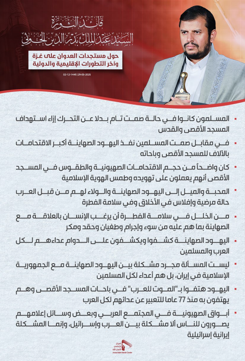 السيد_عبدالملك_بدرالدين_الحوثي: المحبة والميل إلى اليهود الصهاينة والولاء لهم من قبل العرب حالة مرضية وإفلاس في الأخلاق وفي سلامة الفطرة On مايو 29, 2025