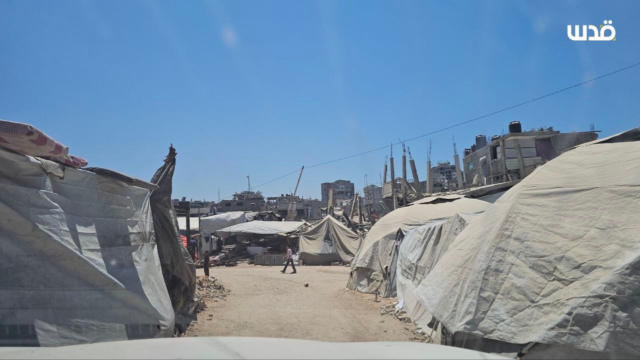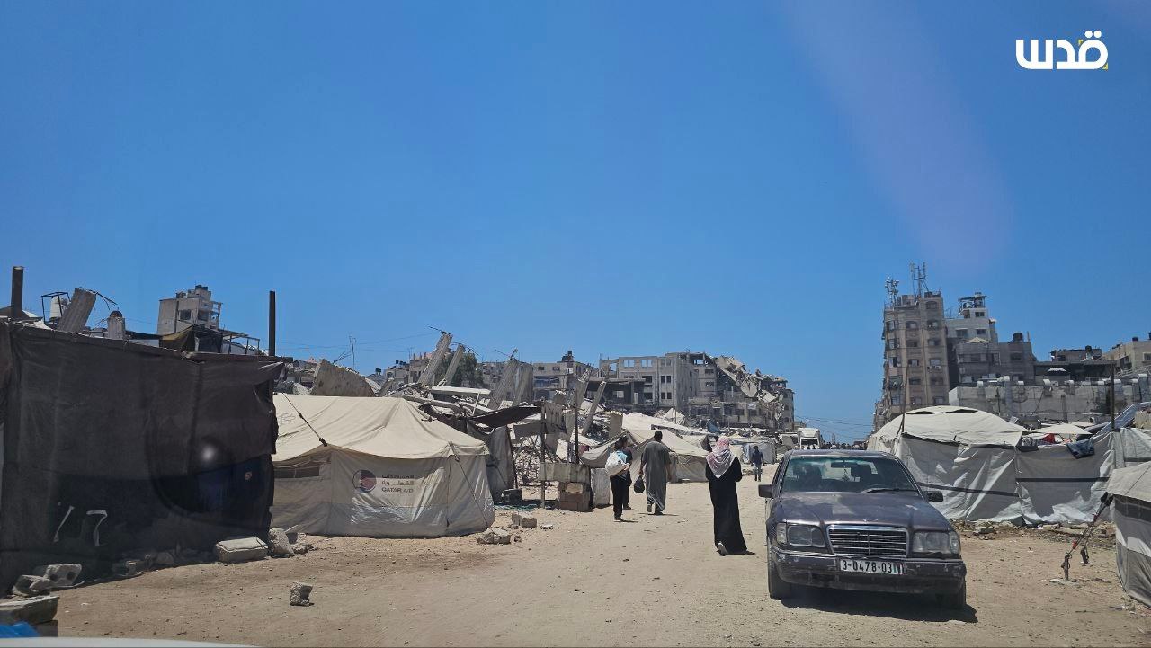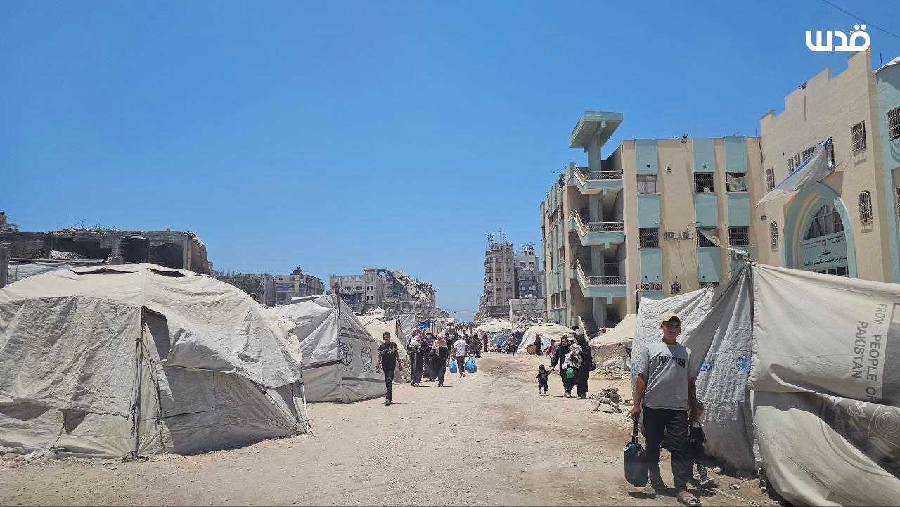 هكذا اصبحت الشوارع محيط مستشفى الرنتيسي للأطفال بمنطقة النصر بمدينة غزة بعد اكتظاظ مراكز الإيواء حيث باتت الخيام تنصب في الشوارع والطرقات. On يونيو 25, 2025
