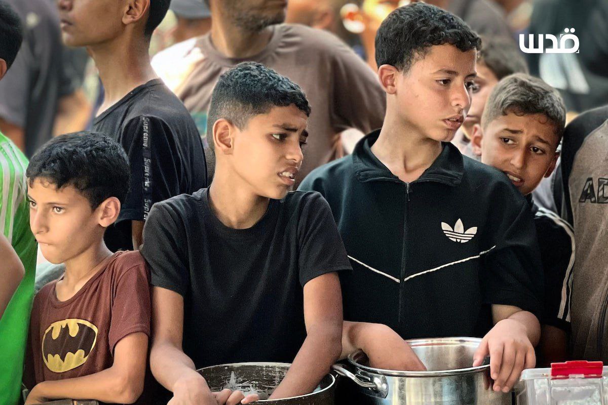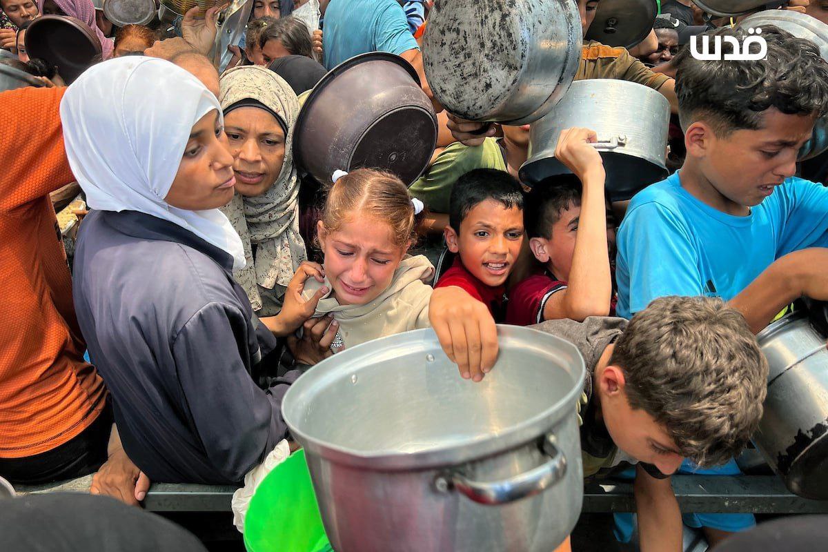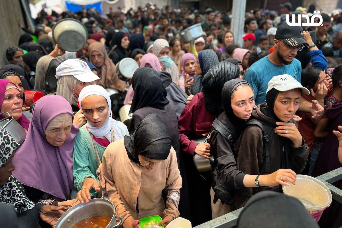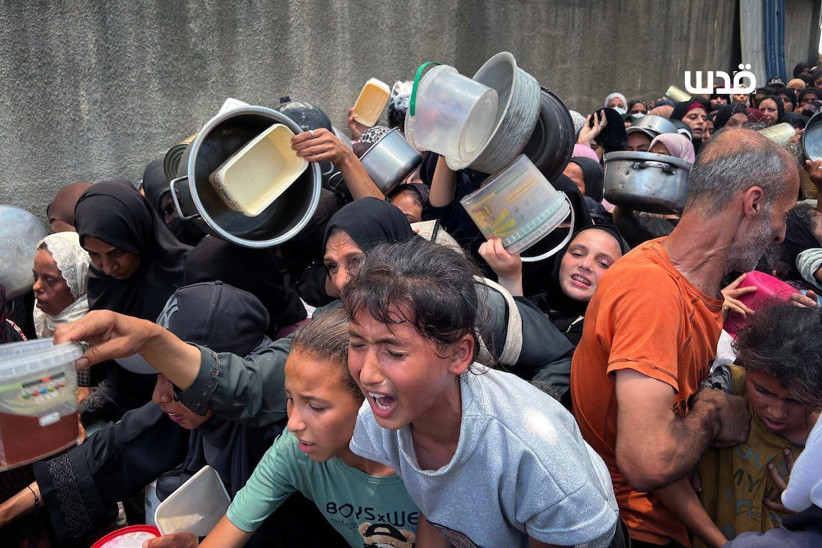 فلسطينيون يتجمعون أمام تكية خيرية بمخيم النصيرات وسط قطاع غزة؛ للحصول على قليل من الطعام، مع استمرار الحصار والمجاعة وعدوان الاحتلال On يونيو 26, 2025
