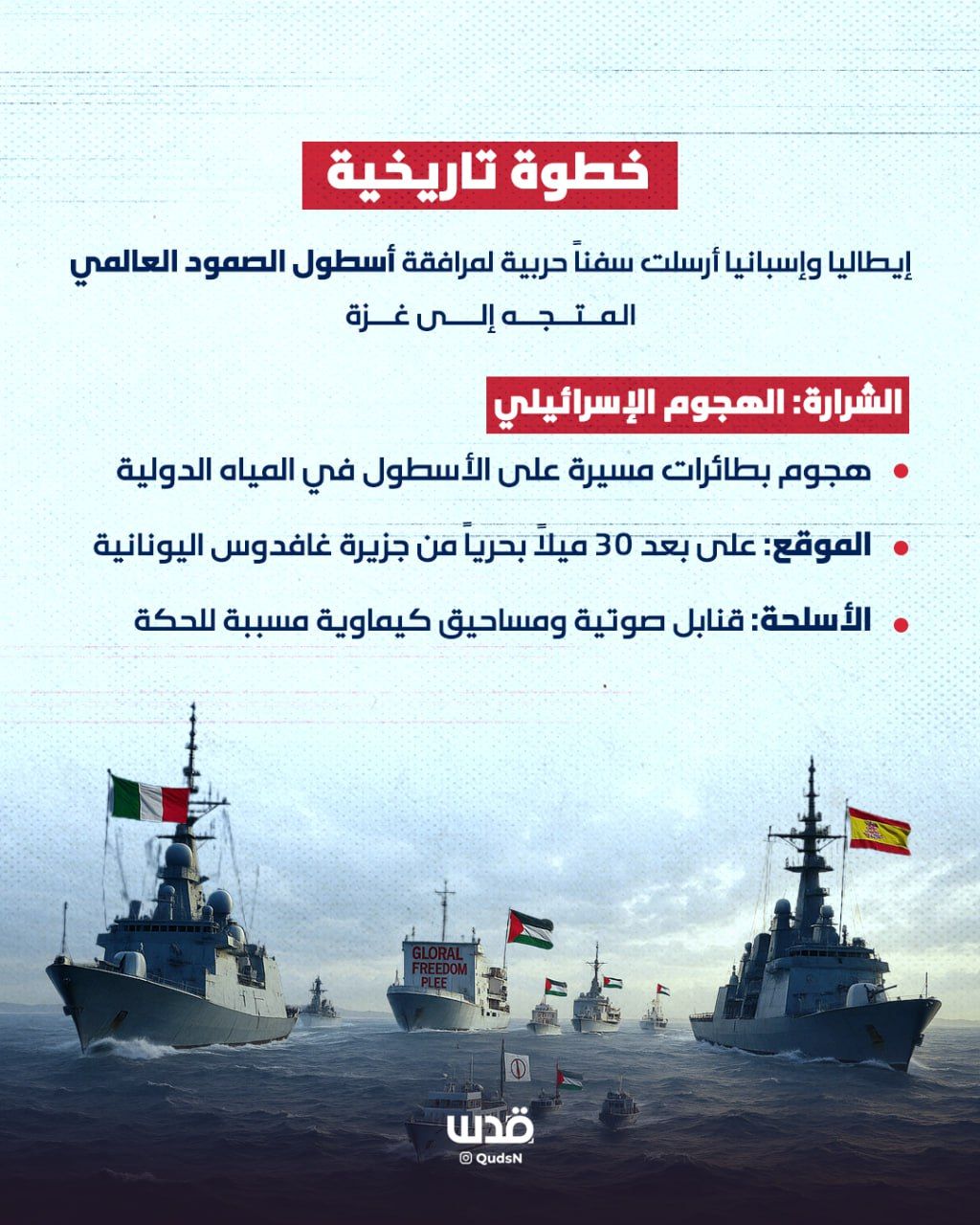 بالصورة | اختراق تاريخي: إيطاليا وإسبانيا ترسلان سفنًا حربية لمرافقة أسطول “الصمود العالمي” المتجه لكسر الحصار عن غزة.. On سبتمبر 27, 2025