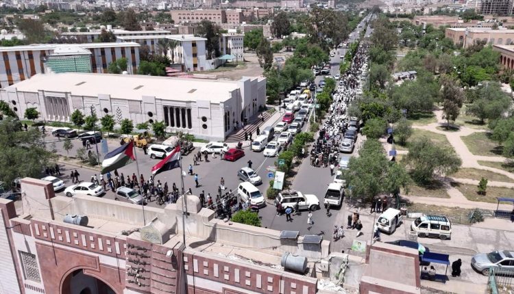 انطلق المسير الطلابي من كلية اللغات وصولاً إلى ساحة العرض خلف كلية الهندسة، حيث رفع الطلاب العلمين اليمني والفلسطيني، مرددين شعارات الحرية ومنددين بمجازر الإبادة والتجويع التي يرتكبها الاحتلال الإسرائيلي والأمريكي بحق الشعب الفلسطيني في غزة.