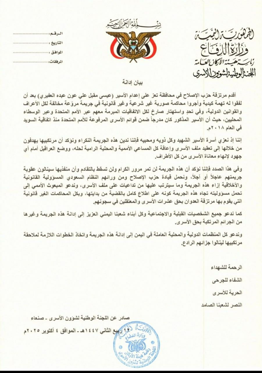 أدانت اللجنة الوطنية لشؤون الأسرى بشدة إقدام مرتزقة حزب الإصلاح في محافظة تعز على إعدام الأسير عيسى مقبل علي عون العفيري.