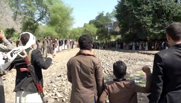 نظم أبناء عزلة بني عمرو بمديرية الحيمة الداخلية في محافظة صنعاء، اليوم، وقفة مسلحة حاشدة تأكيدًا على دعمهم وإسنادهم لقطاع غزة.