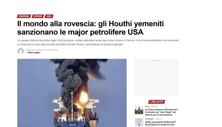 كشفت مجلة “سيناري إيكونوميك – Scenarieconomici” الإيطالية المتخصصة في تحليل القضايا الاقتصادية والسياسية والشؤون الدولية أن ” اليمن أعلن فرض عقوبات على كبرى شركات النفط الأمريكية، في مقدمتها “إكسون موبيل” و“شيفرون”، لتصبح اليمن أول دولة في المنطقة ترد على العقوبات الأمريكية بإجراءات معاكسة تطال قلب الاقتصاد الأمريكي ذاته”.