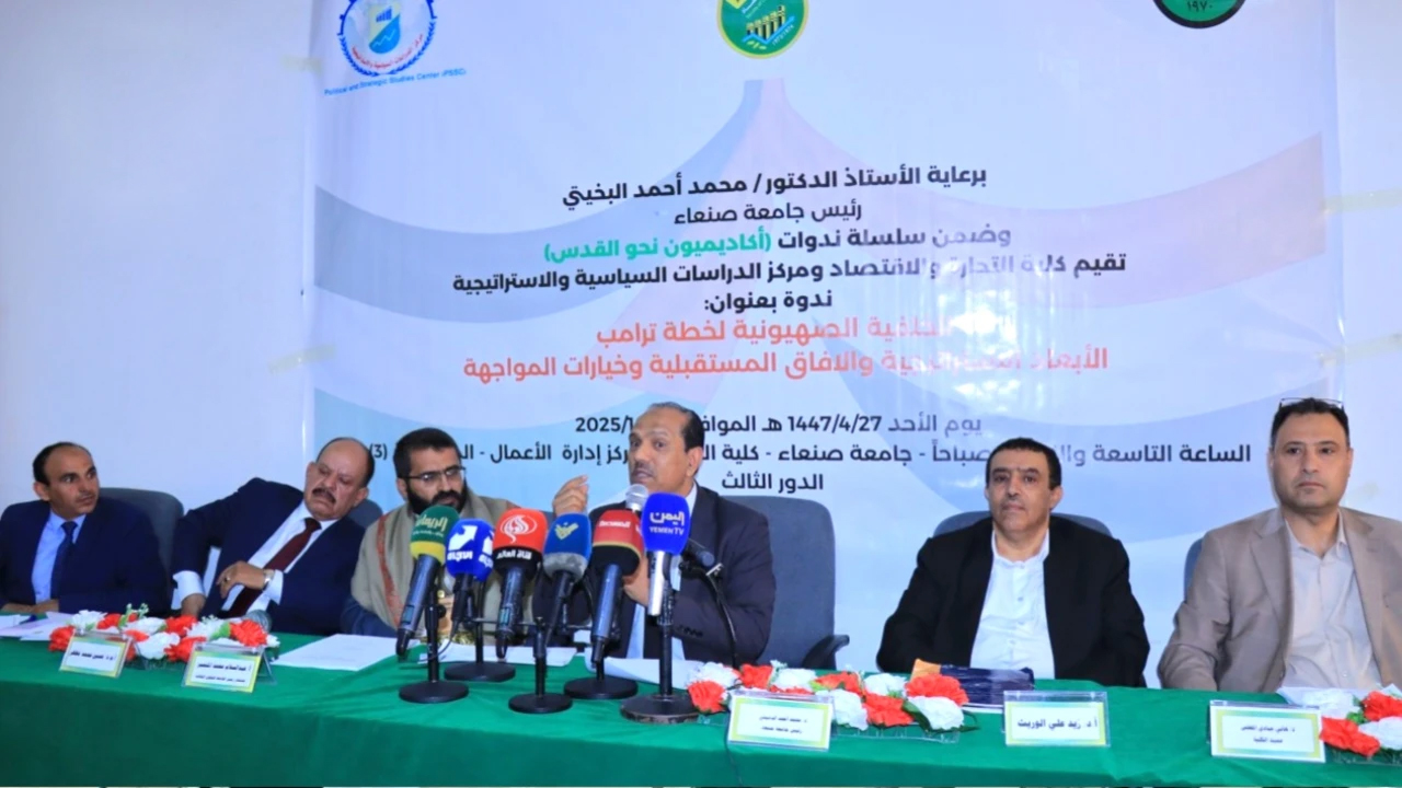 دشّنت جامعة صنعاء اليوم الأحد سلسلة ندواتها الفكرية والثقافية تحت شعار “أكاديميون نحو القدس”، بعقد ندوة بعنوان “الخلفية الصهيونية لخطة ترامب، الأبعاد الاستراتيجية والآفاق المستقبلية وخيارات المواجهة”، نظمتها كلية التجارة والاقتصاد ومركز الدراسات السياسية والاستراتيجية.