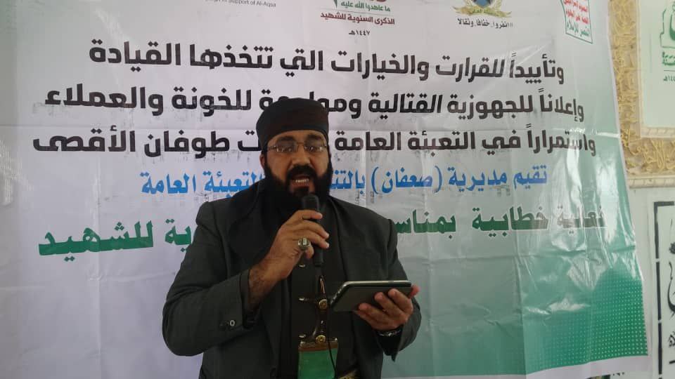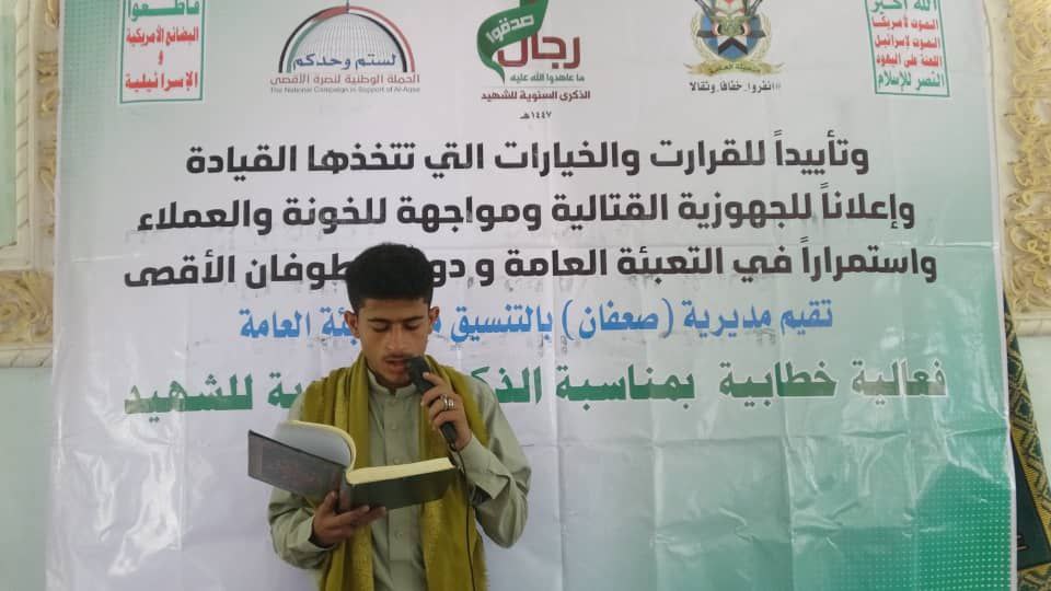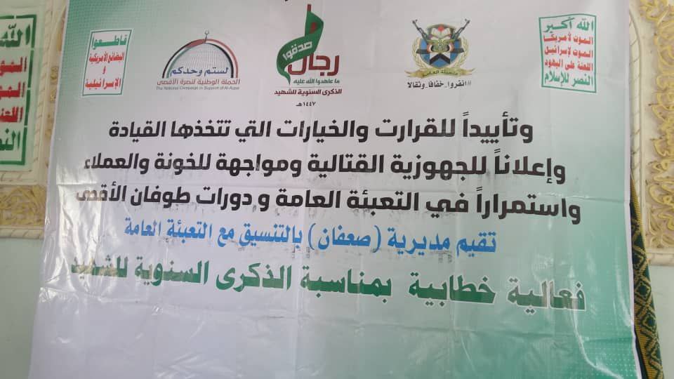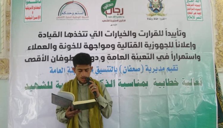 أحيت مديرية صعفان بمحافظة صنعاء، اليوم، الذكرى السنوية للشهيد بفعالية خطابية مركزية، حضرها قيادة السلطة المحلية والتعبئة العامة.