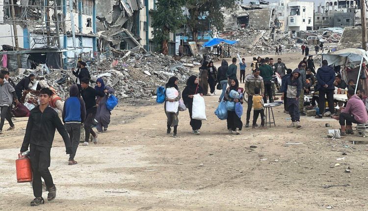 النازحون يصلون إلى منازلهم المدمرة في منطقة الزنة شرق مدينة خان يونس؛ لنقل بعض مقتنياتهم المتبقية من تحت الأنقاض