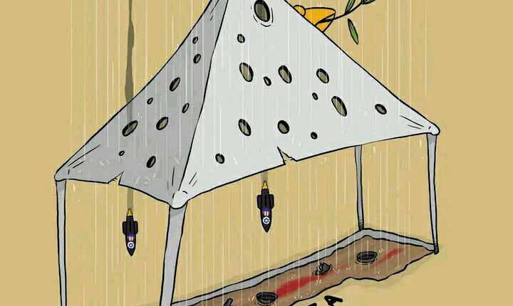 كاريكاتير.. صواريخ أمريكا الصهيونية تقتل المدنيين في خيام السلام بغزة !!
