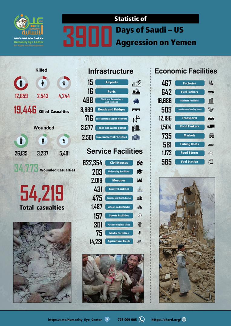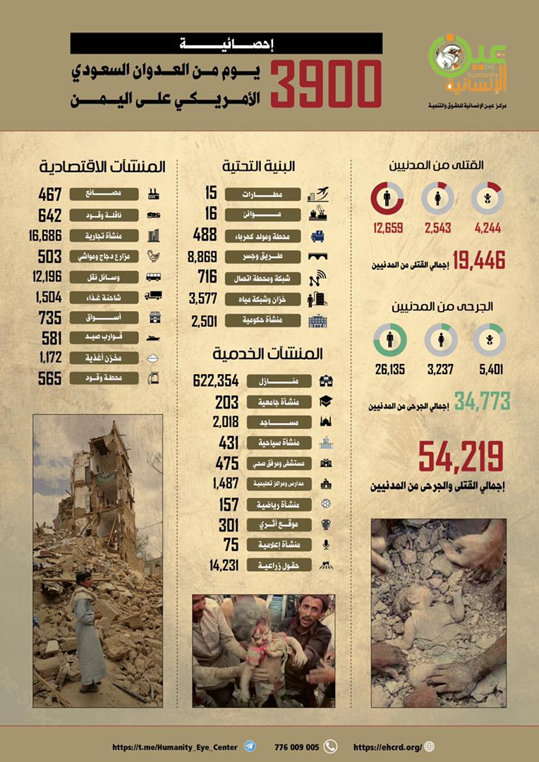 كشف مركز عين الإنسانية للحقوق والتنمية، اليوم الأربعاء، عن الحصيلة الإجمالية للخسائر البشرية والمادية التي تسبب بها “تحالف العدوان الأمريكي السعودي الإماراتي” على اليمن على مدى 3,900 يوم.