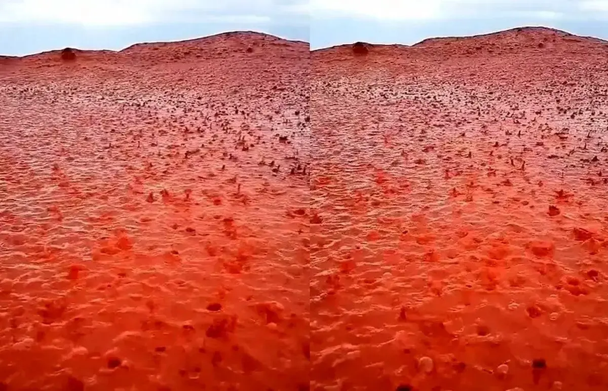 وانسابت أنهار من المياه الممزوجة بالتربة الغنية بأكسيد الحديد من المنحدرات الصخرية نحو الساحل، لتغطي الرمال والمياه الضحلة بلون أحمر قاني.
