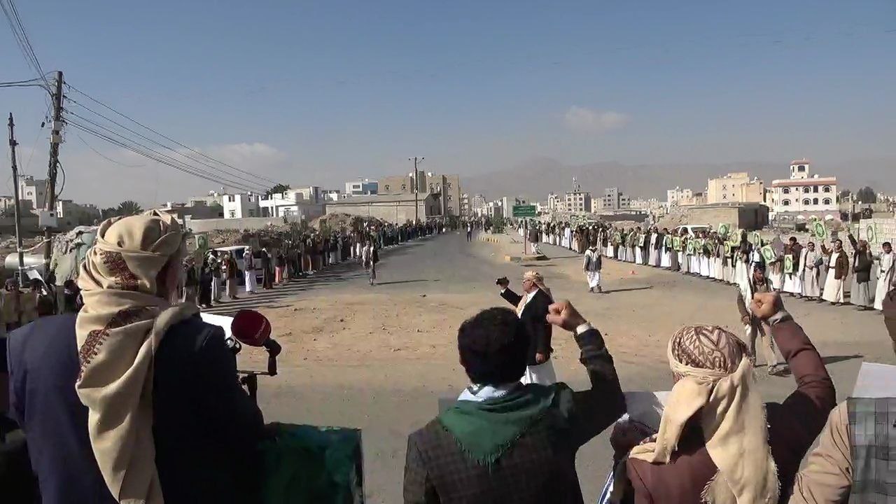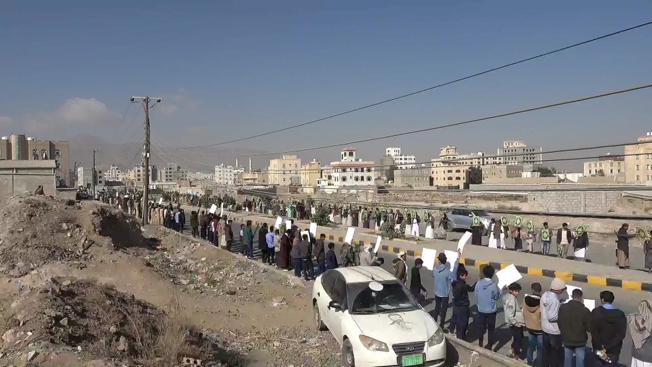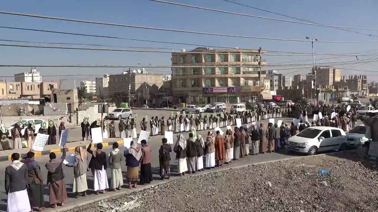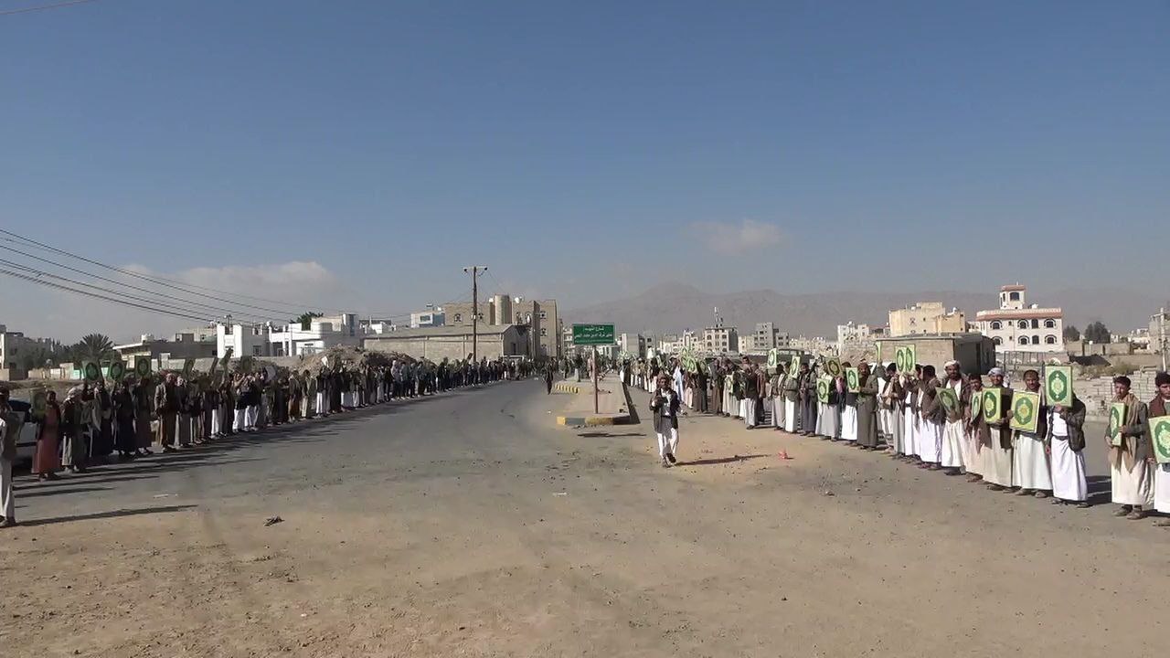 نظم كوادر وطلاب جامعة القرآن الكريم بمحافظة صنعاء، اليوم، وقفة احتجاجية غاضبة استنكاراً للجريمة الأمريكية المتمثلة في الإساءة للقرآن الكريم.