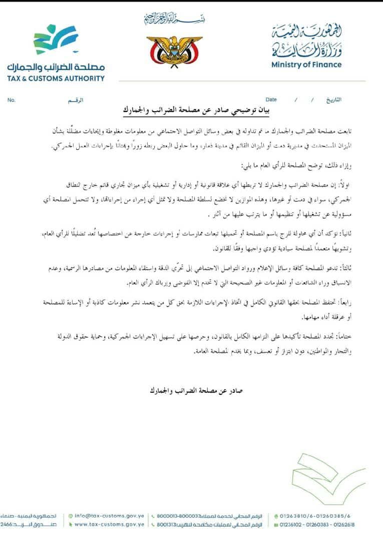 تابعت مصلحة الضرائب والجمارك ما تم تداوله في بعض وسائل التواصل الاجتماعي من معلومات مغلوطة وإيحاءات مضلِّلة بشأن الميزان المستحدث في مديرية دمت أو الميزان القائم في مدينة ذمار، وما حاول البعض ربطه زورًا وبهتانًا بإجراءات العمل الجمركي.