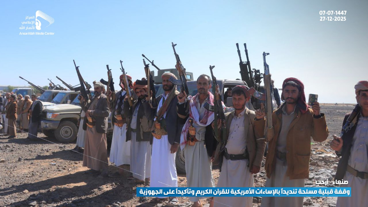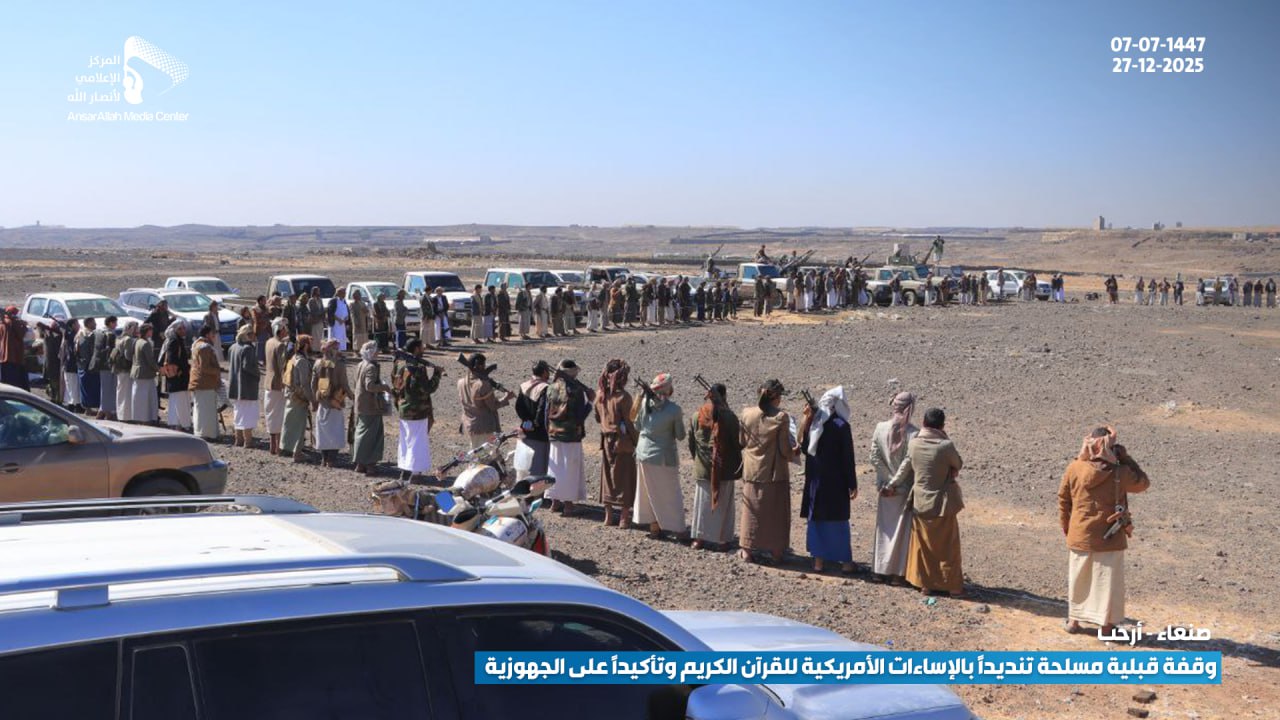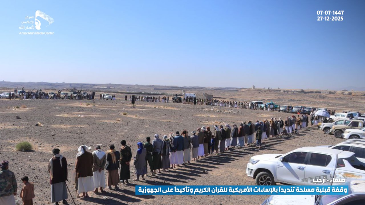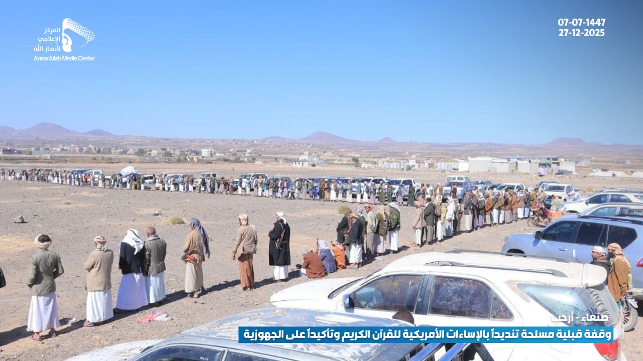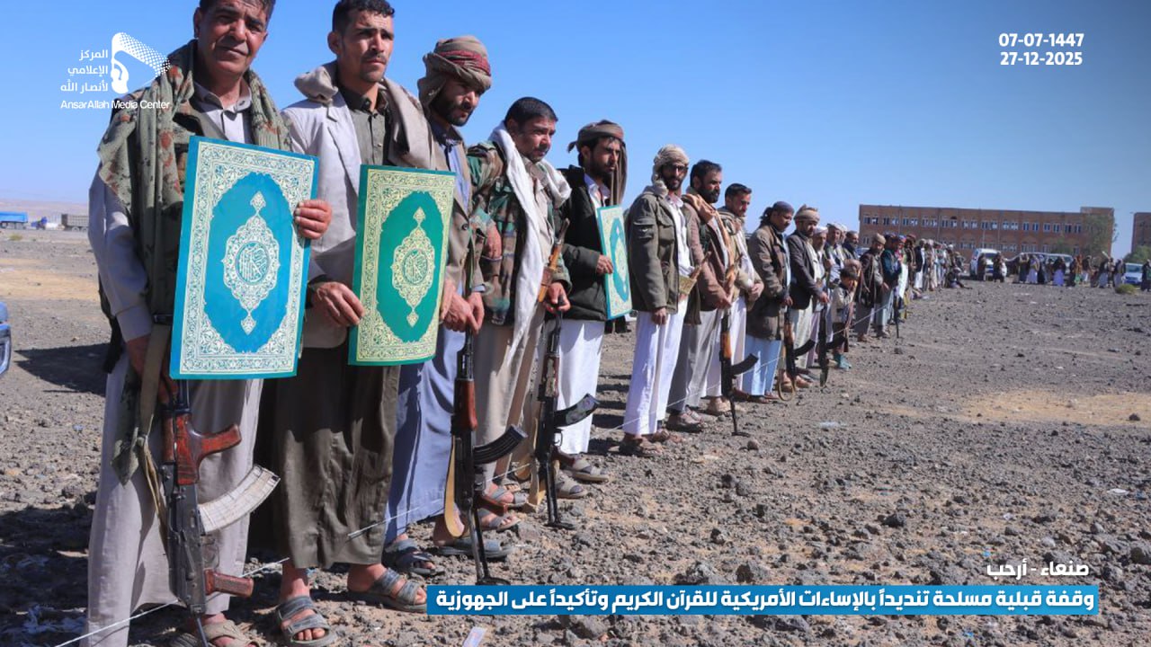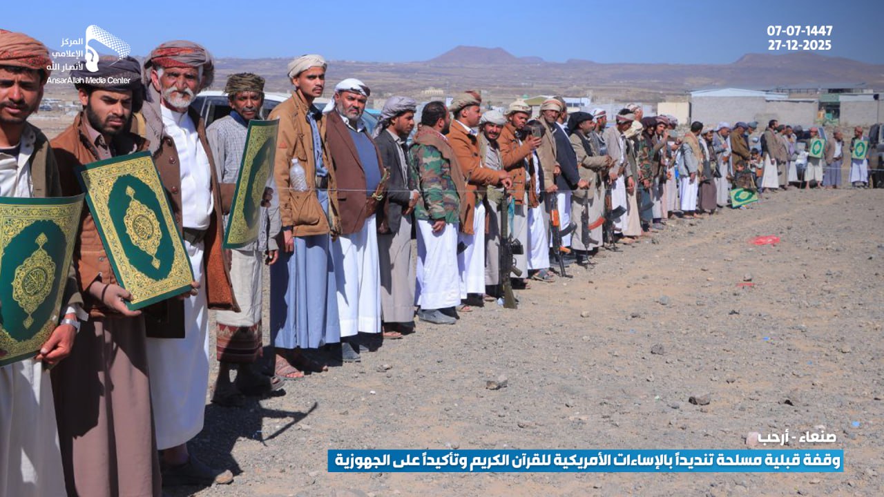 شهدت مديرية أرحب بمحافظة صنعاء، اليوم، وقفة قبلية مسلحة حاشدة لأبناء مربع عزل حسان، والتي شملت مناطق (الثلث، شعب، وهزم)، احتشد فيها المئات من المقاتلين والوجاهات القبلية تنديداً بالإساءات الأمريكية المتكررة والممنهجة بحق القرآن الكريم، وتأكيداً على المضي قدماً في رفع مستوى الجهوزية القتالية لمواجهة التحديات الراهنة.