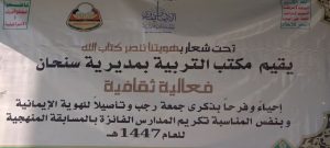 في أجواء إيمانية وتربوية متميزة، نظم مكتب التربية والتعليم والبحث العلمي بمديرية سنحان في محافظة صنعاء، اليوم، فعالية ثقافية وخطابية كبرى إحياءً لذكرى “جمعة رجب” المباركة؛ ذكرى دخول أهل اليمن في دين الله أفواجاً.