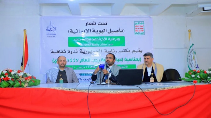 نظّم مكتب رئاسة الجمهورية، اليوم بصنعاء، ندوة ثقافية وتوعوية لترسيخ وتأصيل الهوية الإيمانية، تزامناً مع احتفالات الشعب اليمني بعيد جمعة رجب 1447هـ.