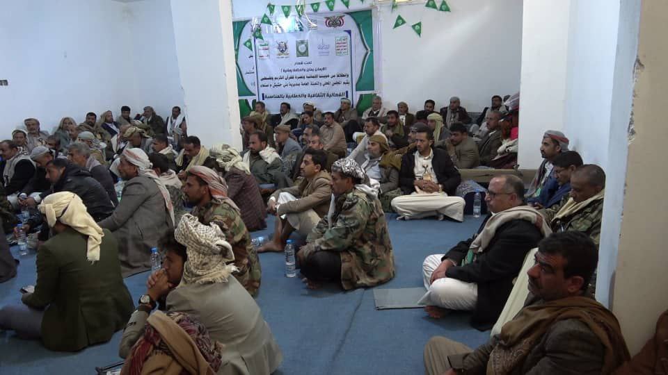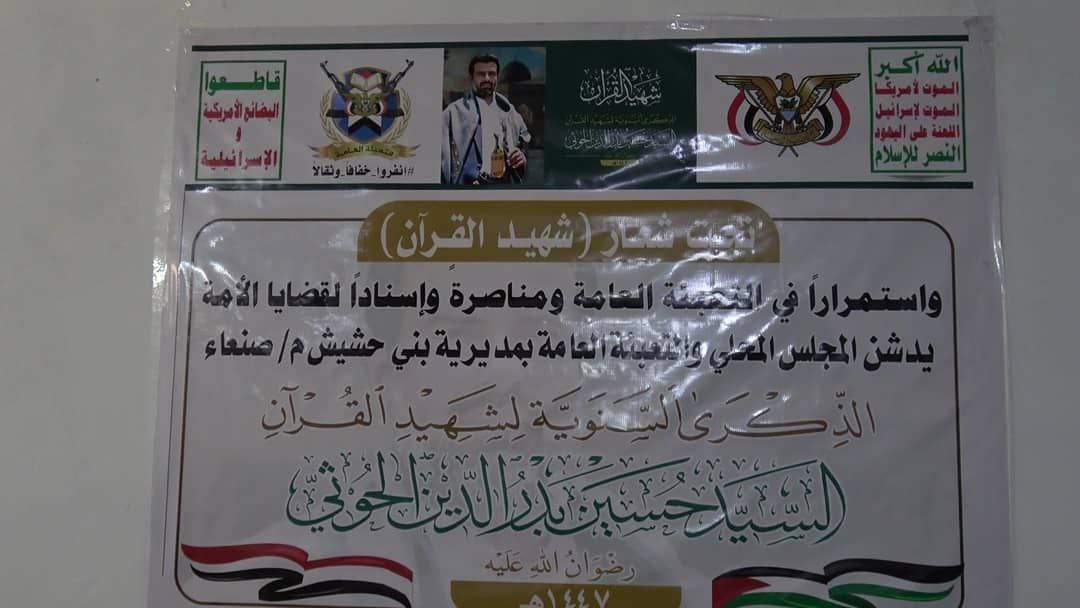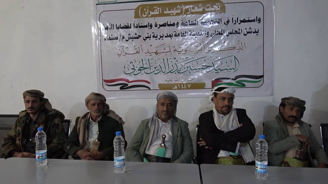 دشنت السلطة المحلية والتعبئة العامة بمديرية بني حشيش في محافظة صنعاء، اليوم، فعاليات الذكرى السنوية لشهيد القرآن السيد حسين بدر الدين الحوثي بفعالية خطابية مركزية.