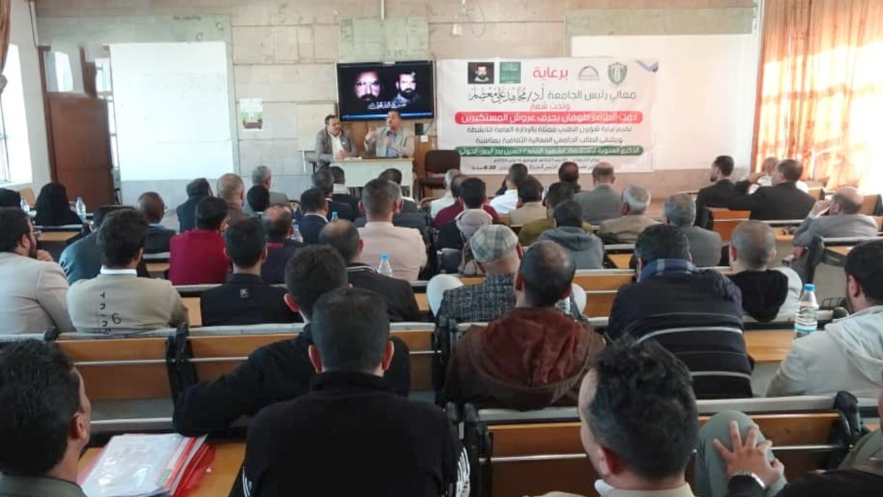 وخلال الفعالية، أكد نائب رئيس الجامعة لشؤون الطلاب، الدكتور جميل مجلي، أن ذكرى الشهيد القائد تمثل محطة لاستلهام قيم الشجاعة والحرية، مشيراً إلى أن مشروعه القرآني كان الانطلاقة الحقيقية لتحرر اليمن من الوصاية الأجنبية ورفض مشاريع الاستكبار العالمي في المنطقة.