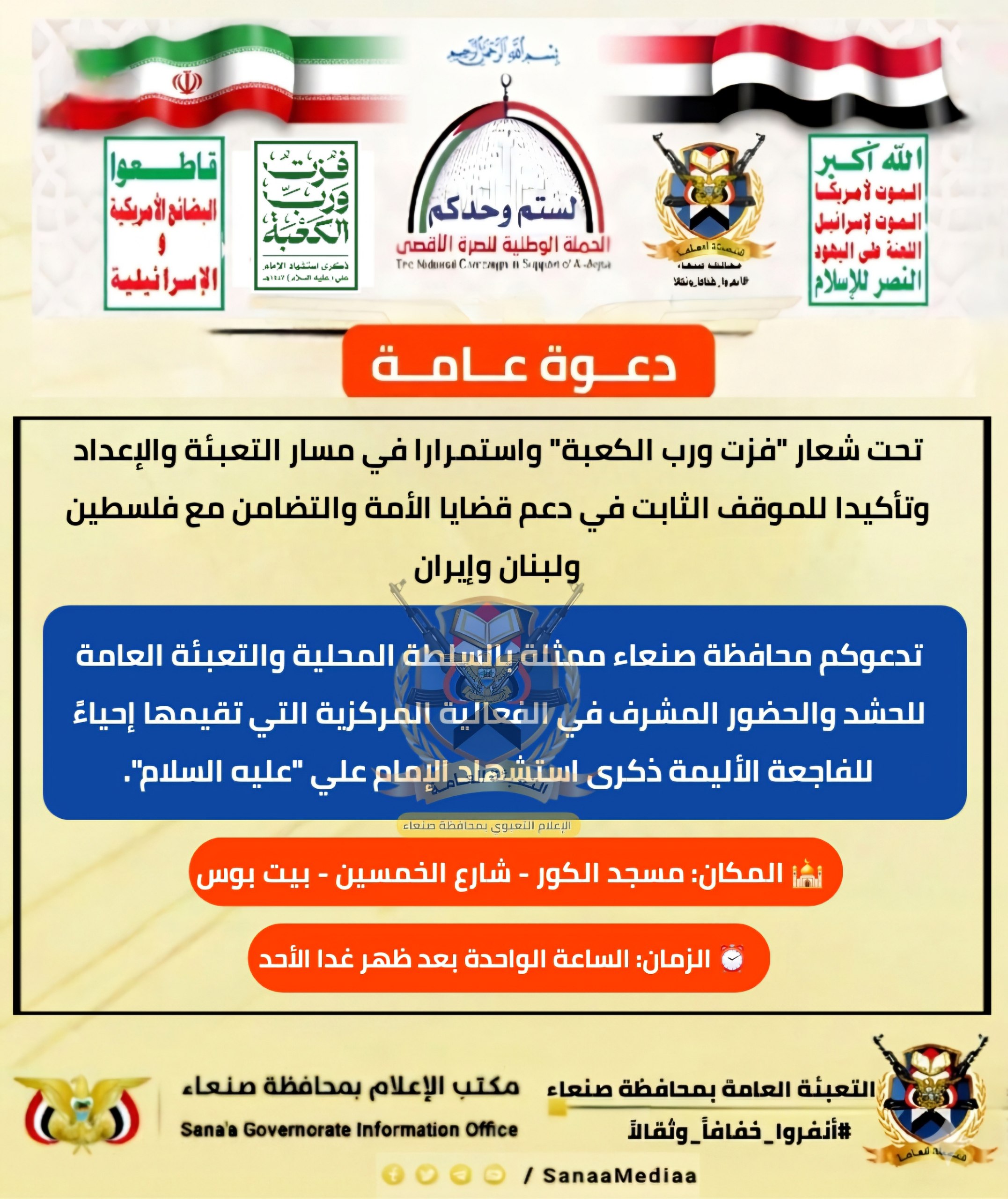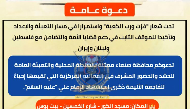 في إطار تعزيز الوعي الإيماني واستمراراً في مسار التعبئة العامة والإعداد الجهادي، دعت قيادة محافظة صنعاء، ممثلة بالسلطة المحلية ولجنة التعبئة العامة، كافة أبناء المحافظة الأحرار إلى الحشد الجماهيري الكبير والمشاركة الفاعلة في الفعالية المركزية التي ستُقام إحياءً للفاجعة الأليمة وذكرى استشهاد الإمام علي بن أبي طالب “عليه السلام” للعام الهجري 1447هـ.
