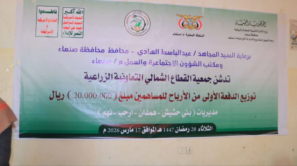 كما جرى التدشين بالتنسيق مع مكتب الشؤون الاجتماعية والعمل، وبحضور قيادات محلية بارزة، حيث شملت عملية التوزيع المساهمين من أبناء مديريات (بني حشيش، همدان، أرحب، ونهم). وتأتي هذه الخطوة لتعزز الثقة بين المجتمع والكيانات التعاونية التي باتت ركيزة أساسية في إدارة الموارد الزراعية.