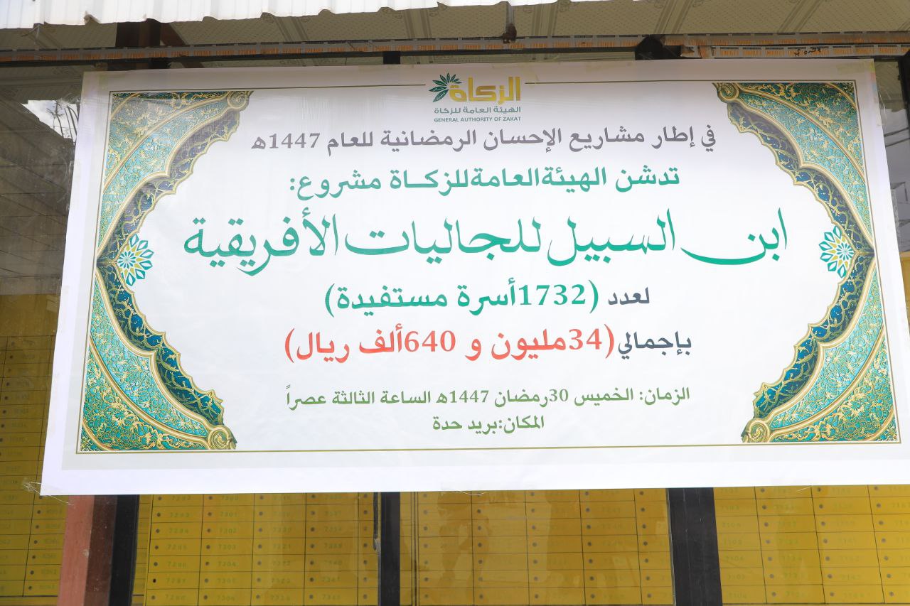 دشنت الهيئة العامة للزكاة اليوم، مشروع ابن السبيل للجاليات الأفريقية بتكلفة 34 مليون و640 ألف ريال في إطار مشاريع الإحسان الرمضانية.