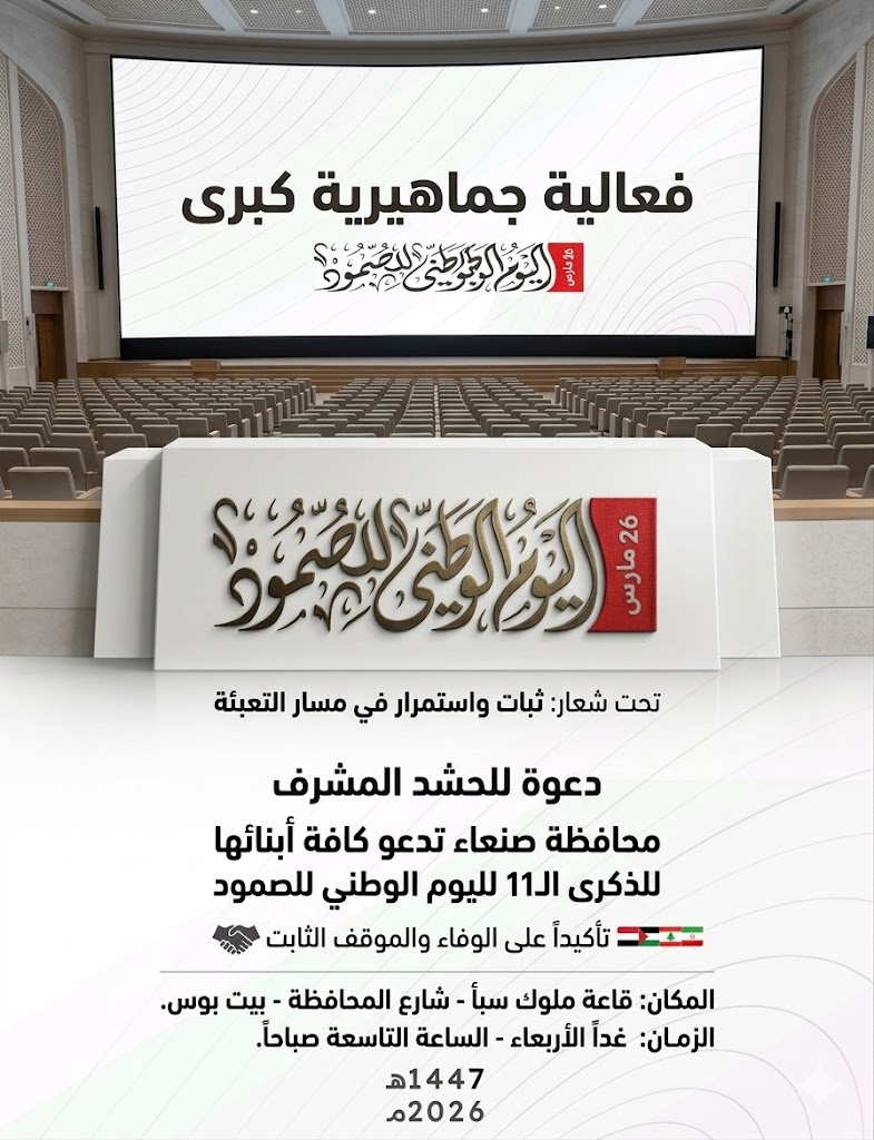 تحت شعار “ثبات واستمرار في مسار التعبئة”، دعت السلطة المحلية والتعبئة العامة بمحافظة صنعاء كافة أبناء المحافظة للحضور والمشاركة الواسعة في الفعالية المركزية لإحياء الذكرى الحادية عشرة لليوم الوطني للصمود.