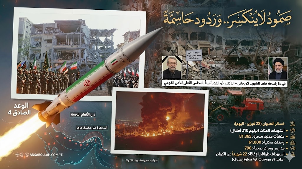 ردًا على العدوان، نفذت إيران موجات متصاعدة من عملية “وعد صادق 4″، مستهدفة مواقع ’’إسرائيلية وأمريكية’’ استراتيجية، بما فيها: إيلات، ديمونا، تل أبيب، وقواعد الجيش الأمريكي في المنطقة، باستخدام صواريخ دقيقة متعددة الرؤوس وطائرات مسيّرة هجومية.. وأكد الحرس الثوري أن هذه الموجات سجّلت صفحة جديدة في تاريخ المواجهة، وأن القسم الأكبر من قوات التعبئة الشعبية وكتائب الباسيج لم تدخل المعركة بعد، ما يتيح لإيران تصعيد الردود في أي وقت وتحويل ساحة المعركة إلى جحيم لا مفر منه للأعداء.