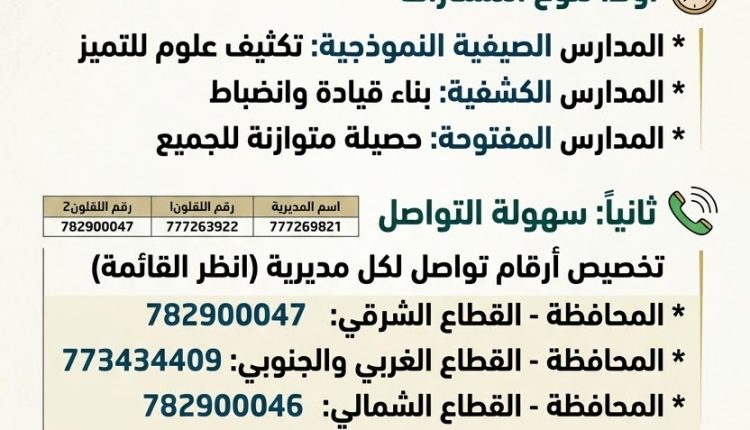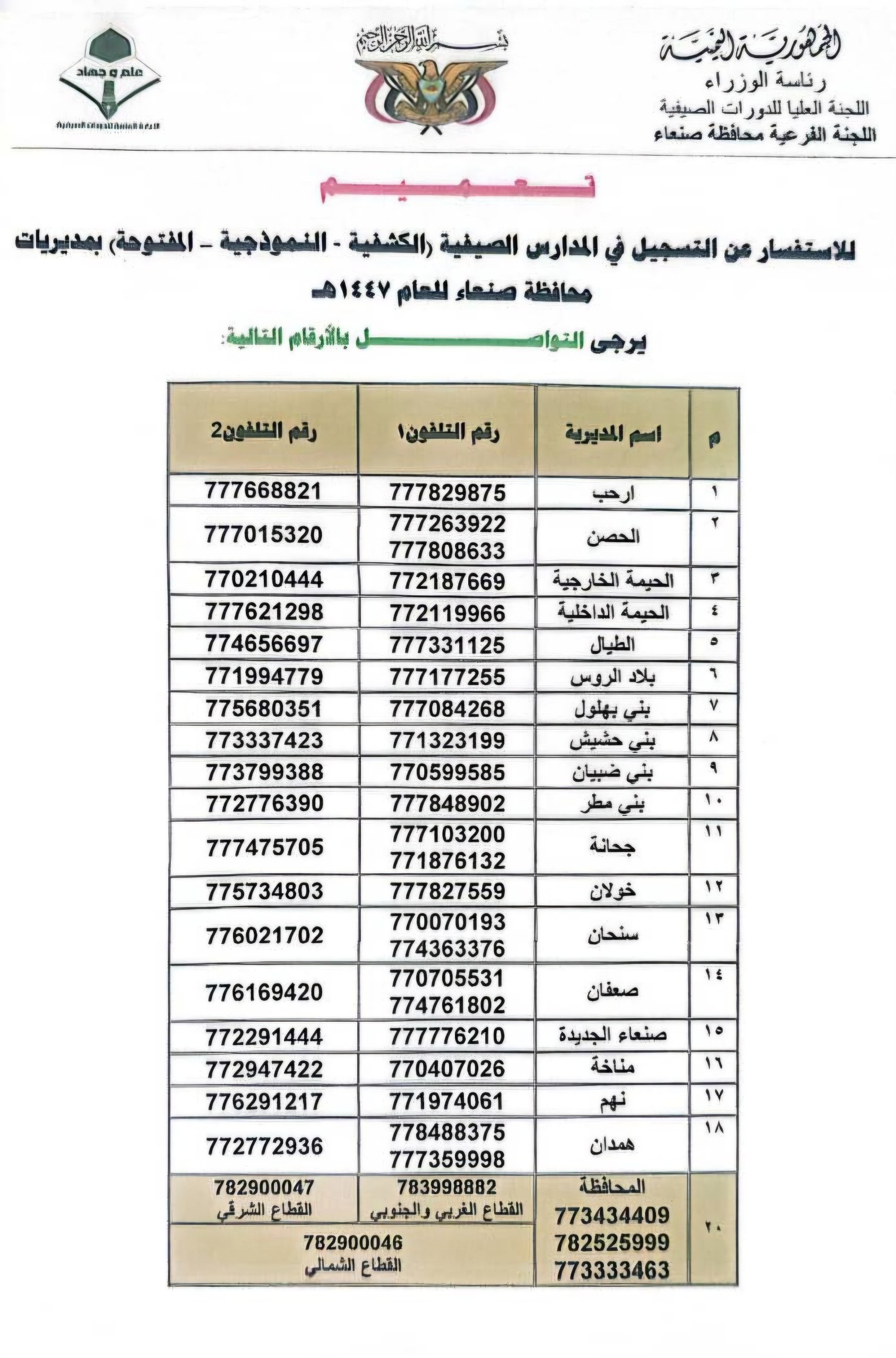 ونهيب بجميع أولياء الأمور الراغبين في تسجيل أبنائهم أو الاستفسار عن مواقع المدارس الصيفية القريبة منهم وشروط القبول، التواصل مع الأرقام المرفقة قرين كل مديرية في القائمة الملحقة بهذا التعميم.