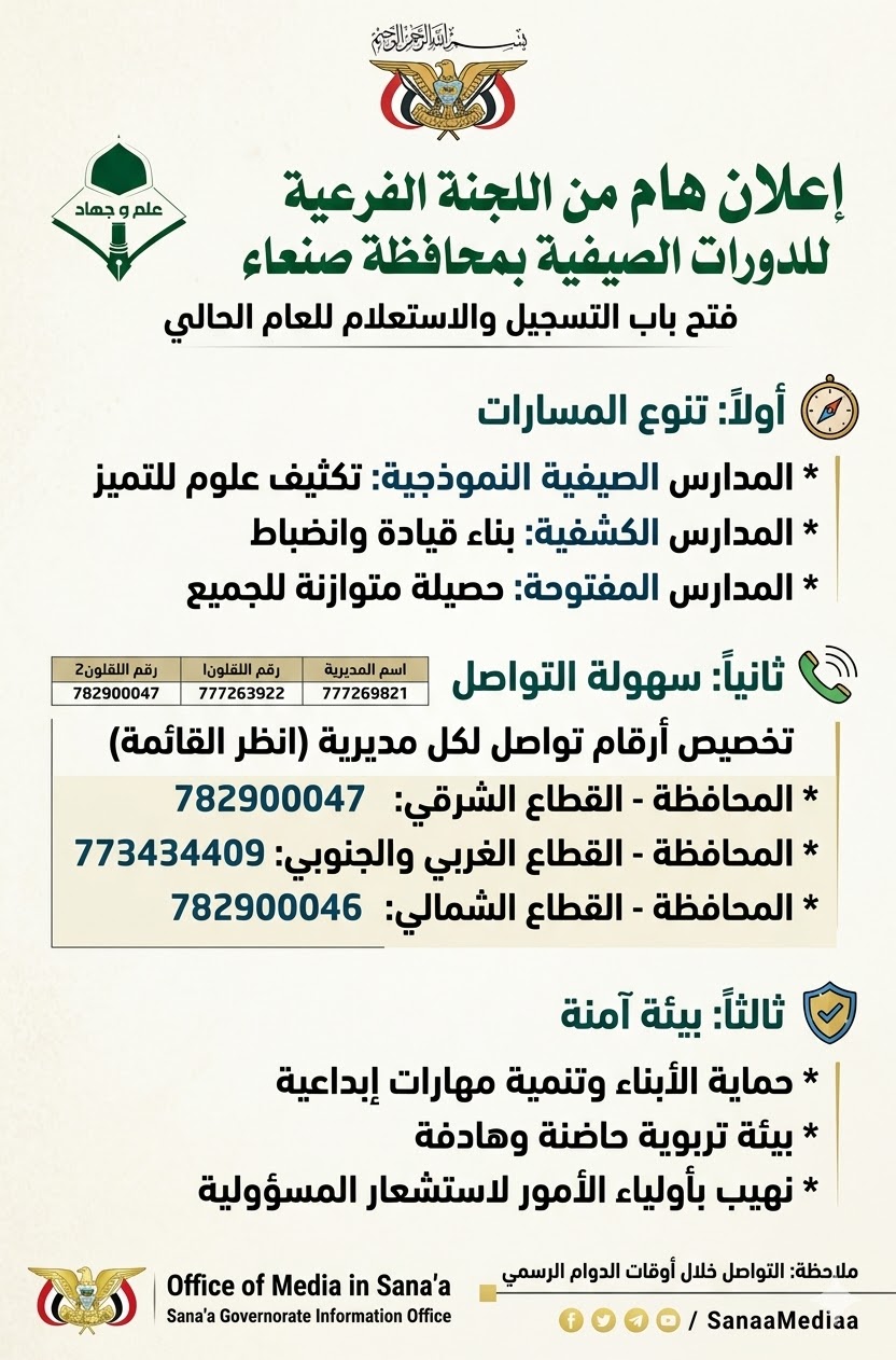 انطلاقاً من الحرص على استغلال الإجازة الدراسية في بناء جيل متسلح بالعلم والوعي والهوية الإيمانية، وتجسيداً لاهتمام القيادة بالنشء والشباب، تعلن اللجنة الفرعية للدورات الصيفية بمحافظة صنعاء عن فتح باب التسجيل والاستعلام للالتحاق بالمدارس الصيفية في مختلف مديريات المحافظة.