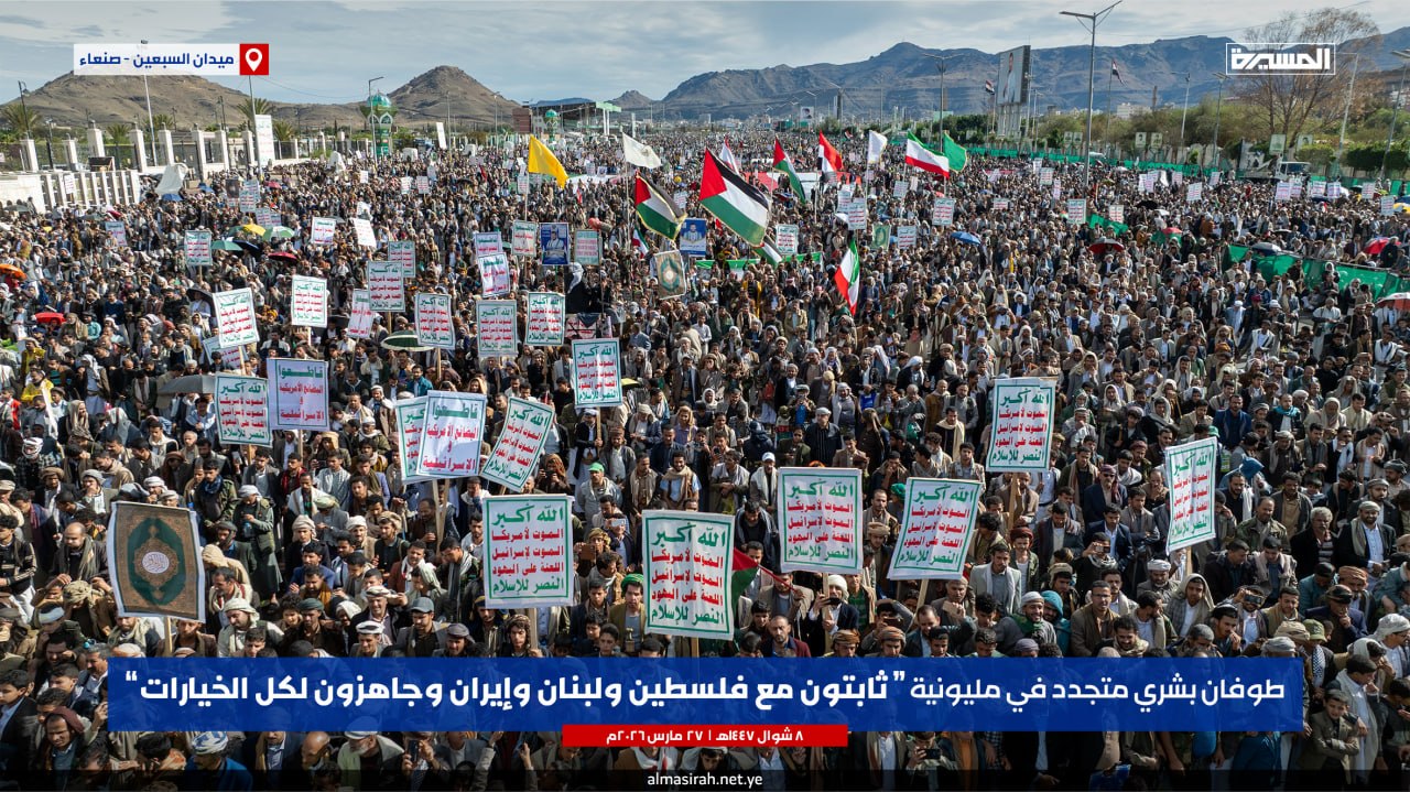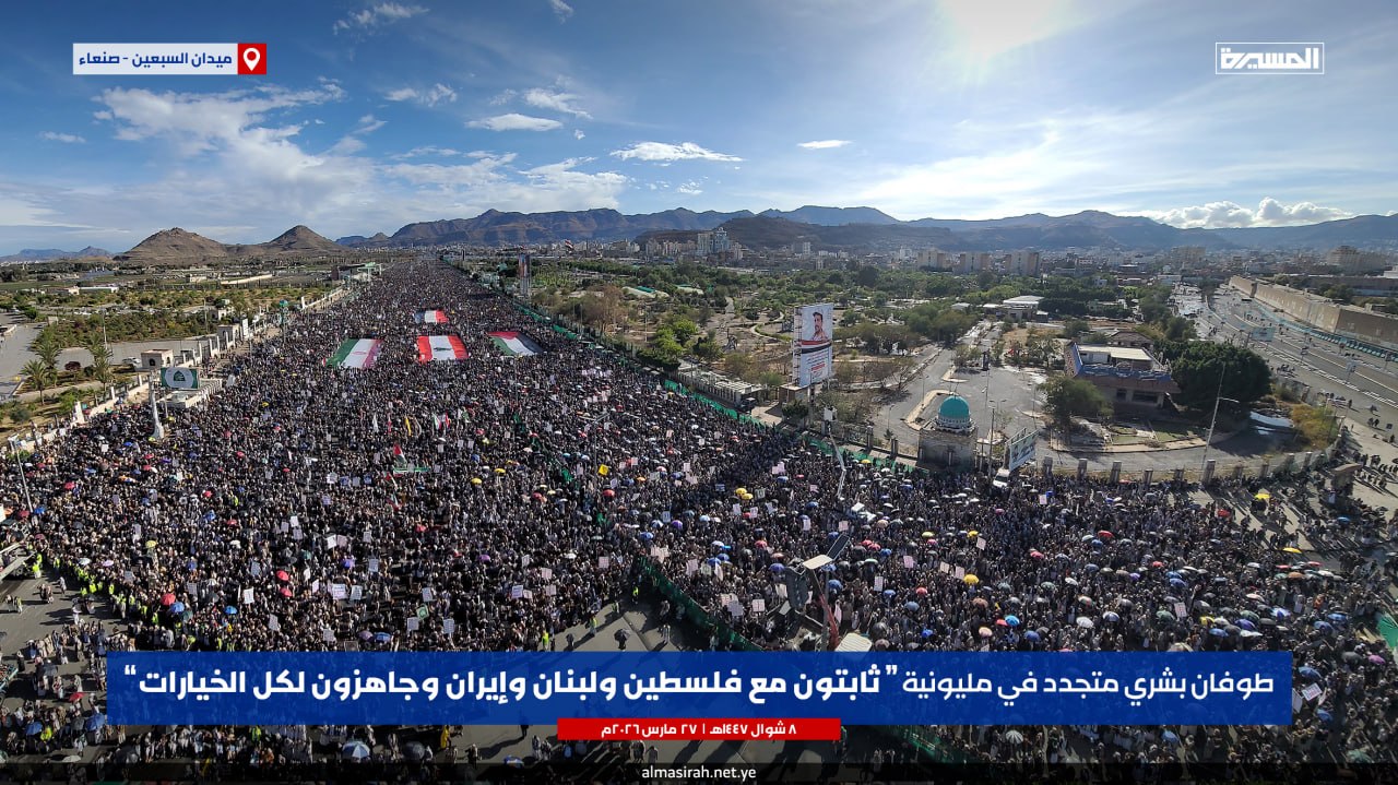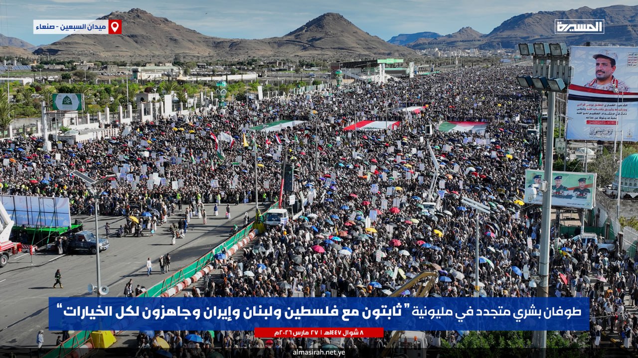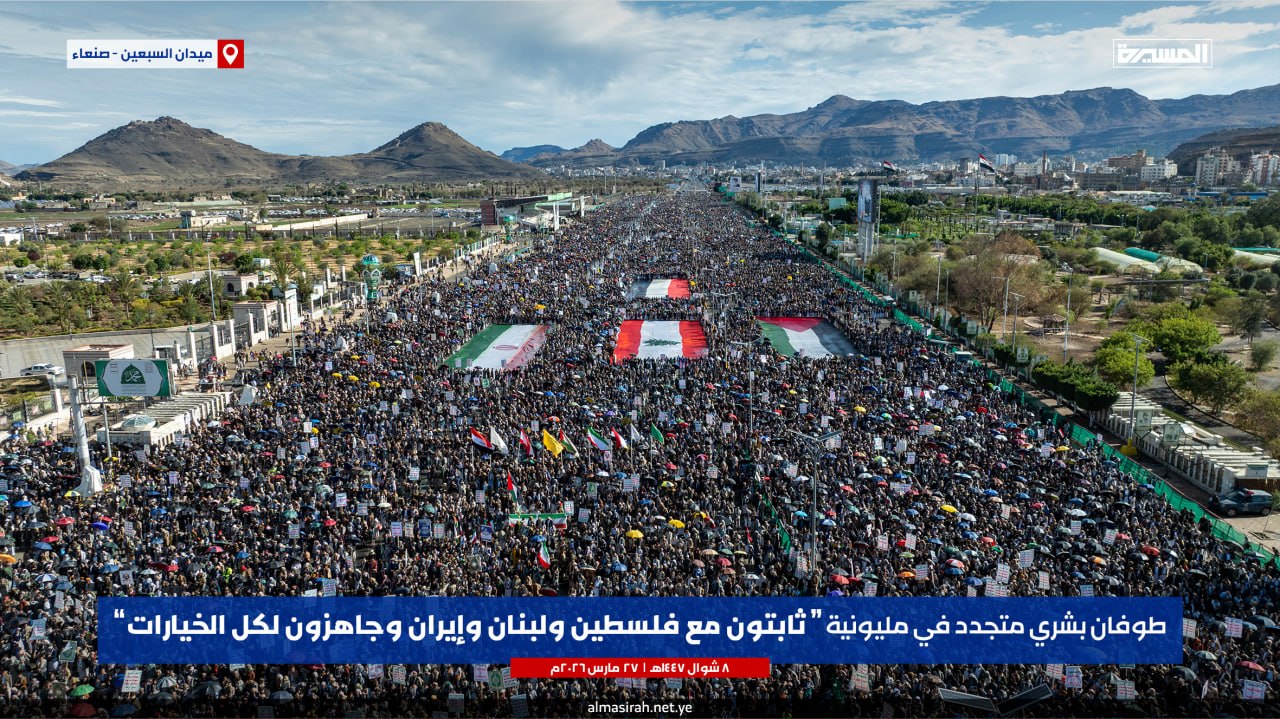 شهدت العاصمة صنعاء، اليوم الجمعة، خروجاً جماهيرياً مليونيراً غير مسبوق، اكتظت به الساحات والشوارع الرئيسية تحت شعار محوري: “ثابتون مع فلسطين ولبنان وإيران.. وجاهزون لكل الخيارات”.