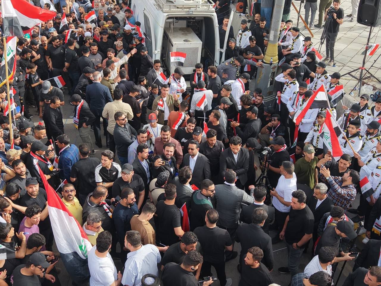 واتسمت المظاهرة المليونية بوحدة الصف، حيث اختلطت فيها أصوات التكبير بهتافات الحرية، ورفعت الأعلام العراقية جنباً إلى جنب مع أعلام فلسطين والمقاومة، في رسالة تضامن عابرة للحدود.