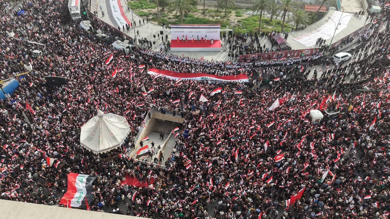 ومنذ الساعات الأولى للصباح، امتلأت المداخل والمخارج المؤدية إلى ساحة التحرير وجسر الجمهورية بآلاف المتظاهرين الذين قدموا من مختلف أحياء العاصمة والمحافظات المجاورة.