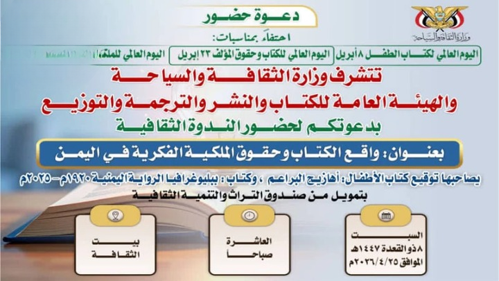 تعتزم وزارة الثقافة والسياحة، ممثلة بقطاع المصنفات والملكية الفكرية، وبالتعاون مع الهيئة العامة للكتاب، تنظيم ندوة ثقافية وتوعوية تحت عنوان “واقع الكتاب وحقوق الملكية الفكرية في اليمن”، وذلك يوم السبت القادم بالعاصمة صنعاء.