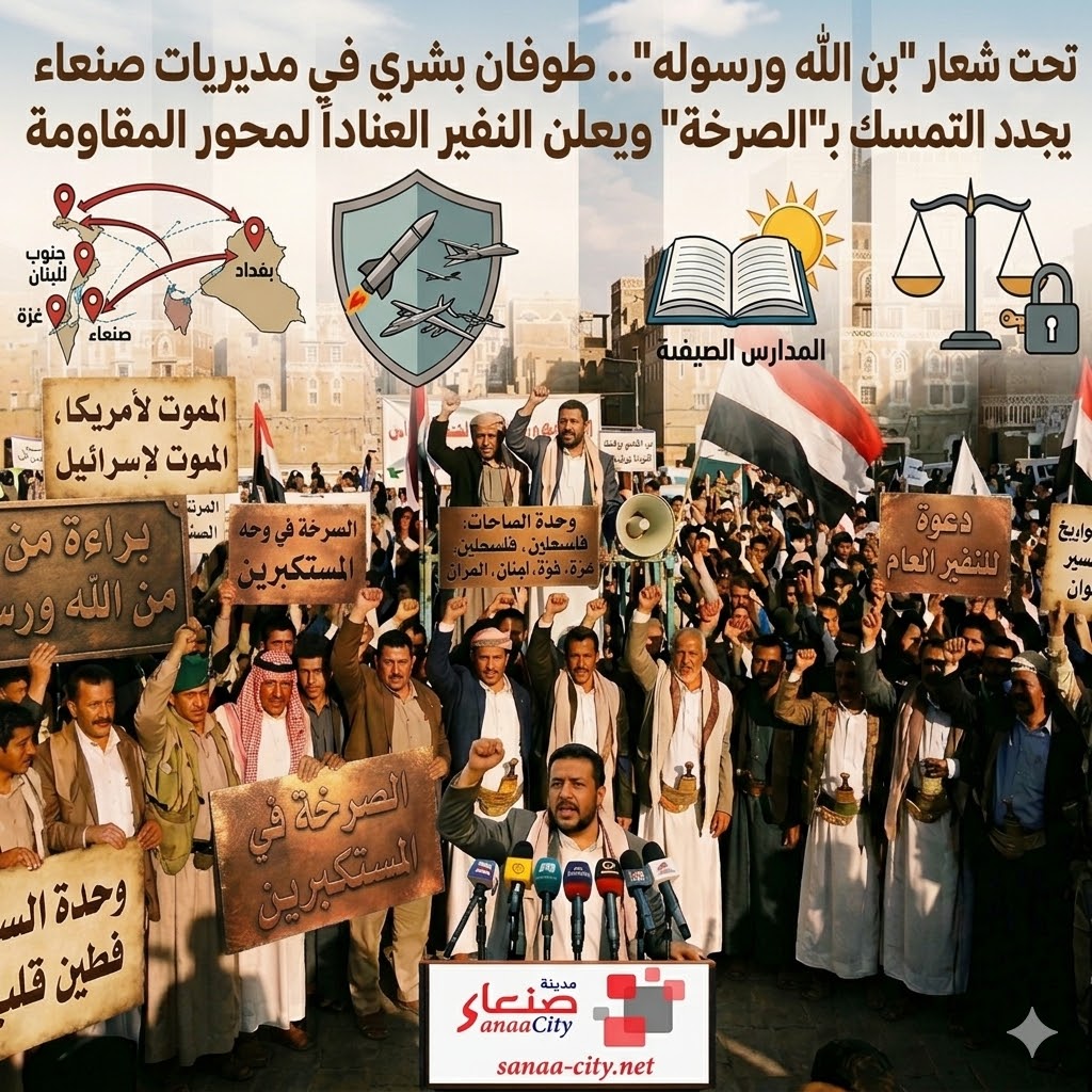 تحت شعار “براءة من الله ورسوله”.. طوفان بشري في مديريات صنعاء يجدد التمسك بـ”الصرخة” ويعلن النفير العام إسناداً لمحور المقاومة