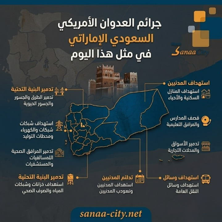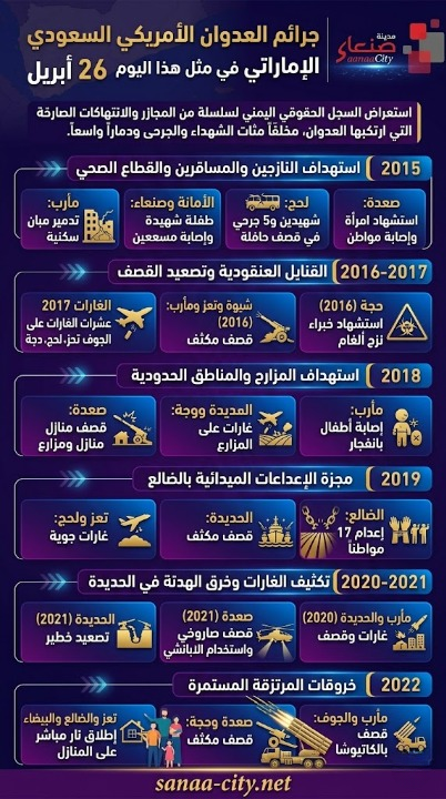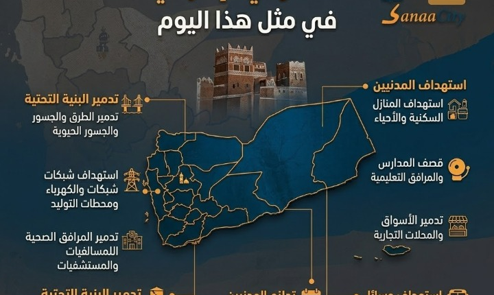 في مثل هذا اليوم من كل عام، يستعرض السجل الحقوقي اليمني سلسلة من المجازر والانتهاكات الصارخة التي ارتكبها العدوان الأمريكي السعودي الإماراتي، مخلفاً مئات الشهداء والجرحى ودماراً واسعاً في البنية التحتية والممتلكات الخاصة والعامة.