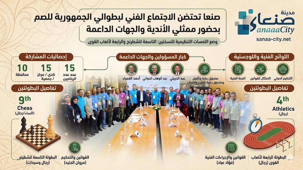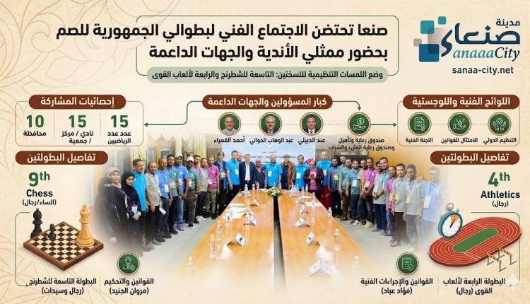 احتضنت العاصمة صنعاء، مساء أمس، الاجتماع الفني الموسع لبطولتي الجمهورية في نسختيهما التاسعة للشطرنج (رجال وسيدات) والرابعة لألعاب القوى (رجال) المخصصة لفئة الصم، وذلك لوضع اللمسات التنظيمية الأخيرة قبل انطلاق المنافسات.