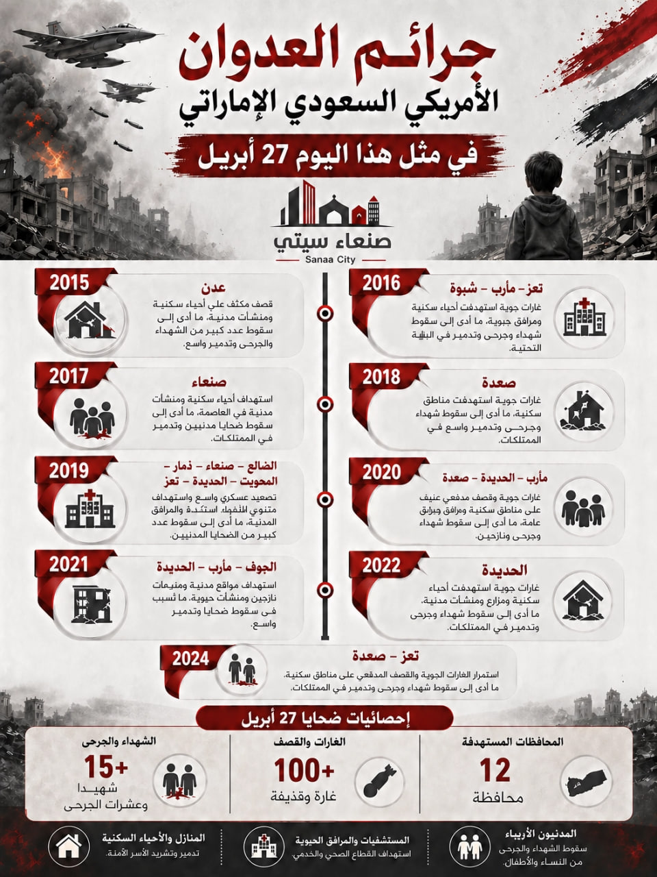 يوافق يوم السابع والعشرين من أبريل محطات مؤلمة في الذاكرة اليمنية، حيث ارتكب طيران العدوان الأمريكي السعودي الإماراتي ومرتزقته على مدى سنوات سلسلة من الجرائم التي استهدفت المدنيين والممتلكات العامة والخاصة، مخلفةً مئات الشهداء والجرحى ودماراً هائلاً في البنى التحتية.