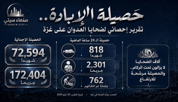 • الشهداء: 72,594 شهيداً، أغلبهم من الأطفال والنساء.
